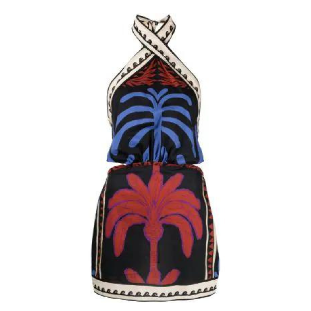 The Adriana Dress is the perfect blend of style and comfort. Its halter neck design adds a touch of sophistication, while the dark palm tree print adds a unique twist. Perfect for any occasion, this mini dress will have you looking and feeling your best.