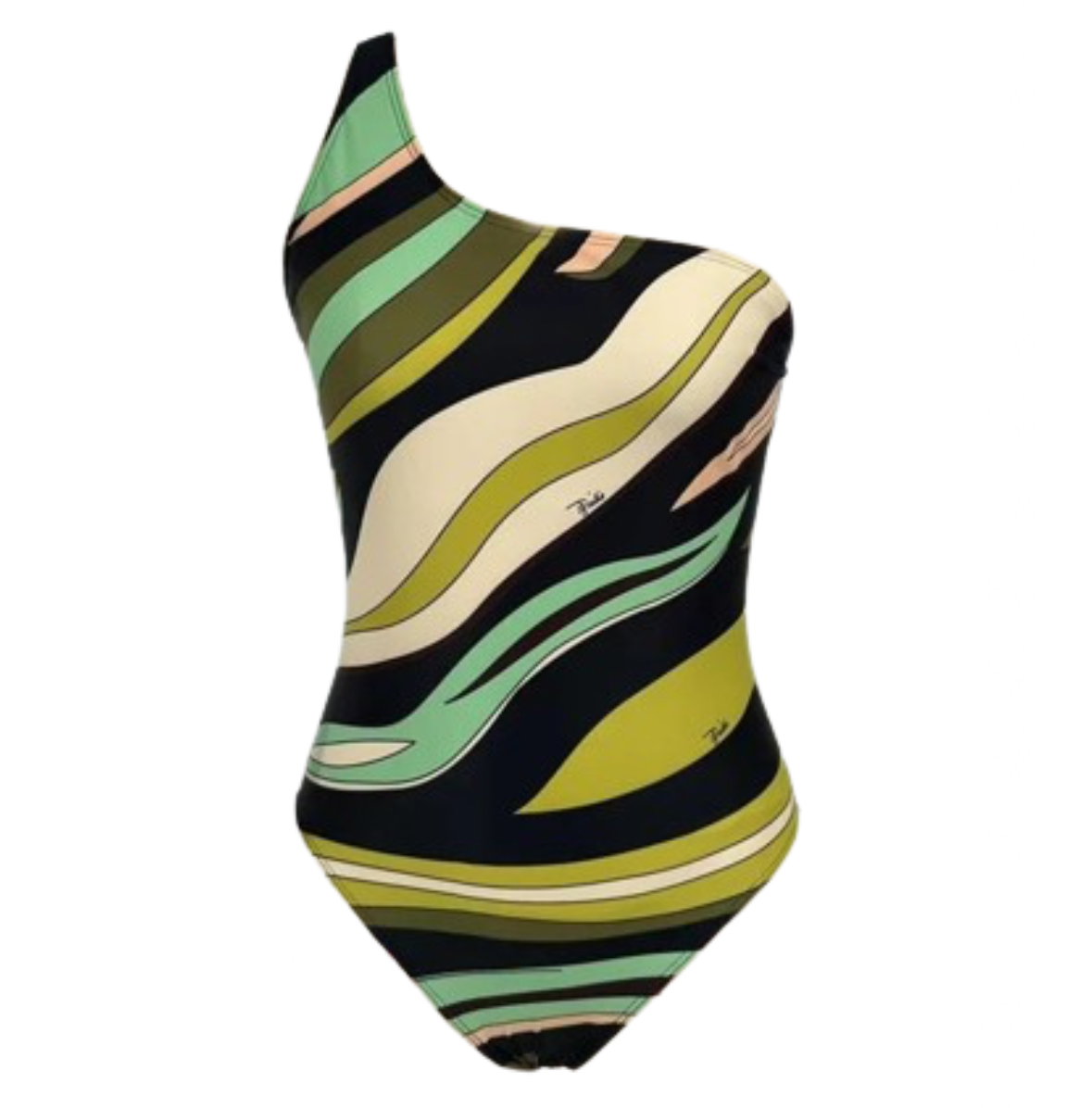 The Carolyn One-piece swimsuit features a stylish one-shoulder design and a vibrant green-based print. Designed for comfort and style, this swimsuit is perfect for making a statement at the beach or pool. With its unique design and eye-catching print, you'll always stand out in the best way.
