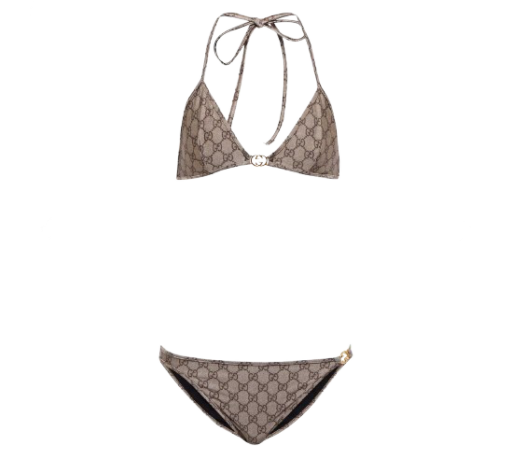 Explore the ultimate blend of fashion and comfort with the Nellie Bikini. Crafted with a brown monogram print, this bikini exudes a luxurious and unique style. The gold details add a touch of sophistication to the design, making it a must-have for any fashion-forward individual.